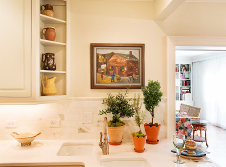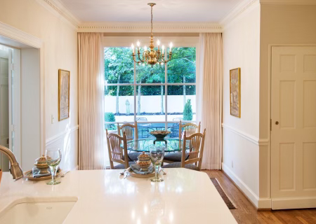 Out came the blue and white stained oak cabinets, a dividing wall, and appliances; no traces of the thirty year old kitchen remained. The kitchen now opens to the breakfast room with it's large window looking to the planted courtyard.